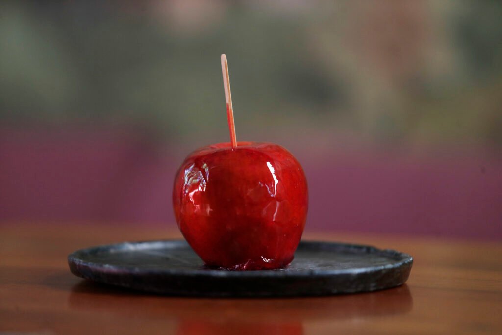 Maçã do Amor feita com maçãs inteiras cobertas por uma cobertura de caramelo de açúcar.